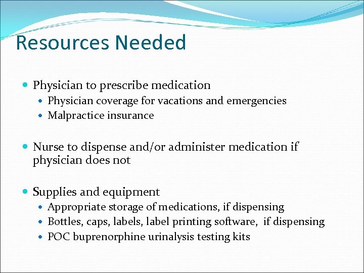 Resources Needed Physician to prescribe medication Physician coverage for vacations and emergencies Malpractice insurance Nurse to dispense and/or administer medication if physician does not Supplies and equipment Appropriate storage of medications, if dispensing Bottles, caps, label printing software, if dispensing POC buprenorphine urinalysis testing kits