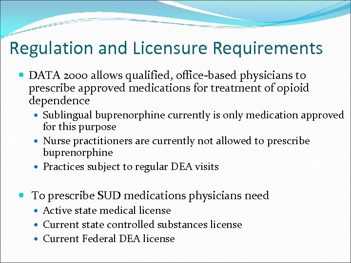 Regulation and Licensure Requirements DATA 2000 allows qualified, office‐based physicians to prescribe approved medications for treatment of opioid dependence Sublingual buprenorphine currently is only medication approved for this purpose Nurse practitioners are currently not allowed to prescribe buprenorphine Practices subject to regular DEA visits To prescribe SUD medications physicians need Active state medical license Current state controlled substances license Current Federal DEA license