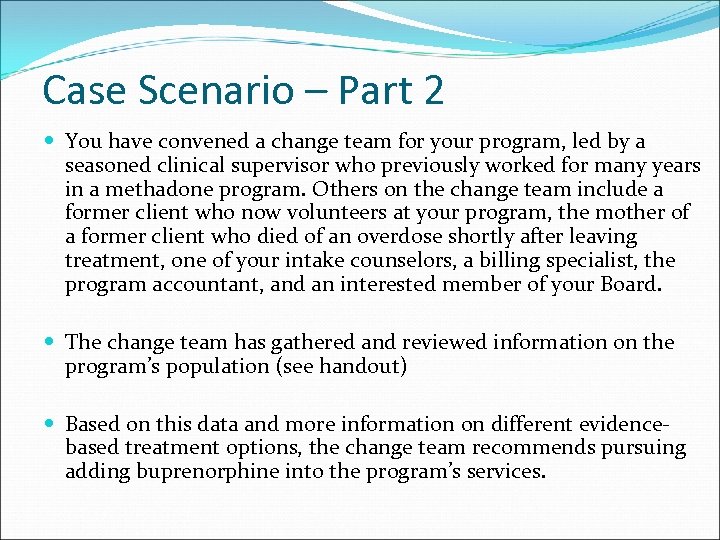 Case Scenario – Part 2 You have convened a change team for your program, led by a seasoned clinical supervisor who previously worked for many years in a methadone program. Others on the change team include a former client who now volunteers at your program, the mother of a former client who died of an overdose shortly after leaving treatment, one of your intake counselors, a billing specialist, the program accountant, and an interested member of your Board. The change team has gathered and reviewed information on the program’s population (see handout) Based on this data and more information on different evidence‐ based treatment options, the change team recommends pursuing adding buprenorphine into the program’s services.