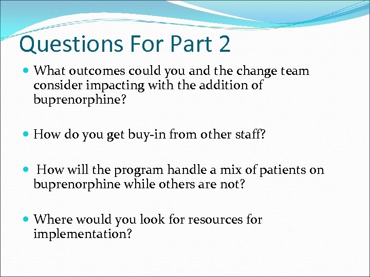 Questions For Part 2 What outcomes could you and the change team consider impacting with the addition of buprenorphine? How do you get buy‐in from other staff? How will the program handle a mix of patients on buprenorphine while others are not? Where would you look for resources for implementation?