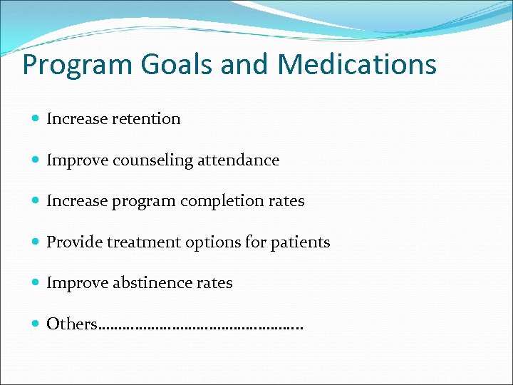Program Goals and Medications Increase retention Improve counseling attendance Increase program completion rates Provide treatment options for patients Improve abstinence rates Others……………………. .