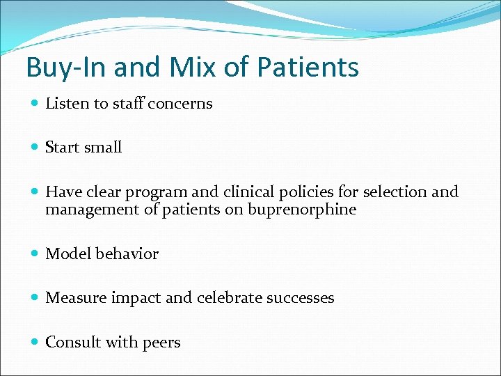 Buy-In and Mix of Patients Listen to staff concerns Start small Have clear program and clinical policies for selection and management of patients on buprenorphine Model behavior Measure impact and celebrate successes Consult with peers