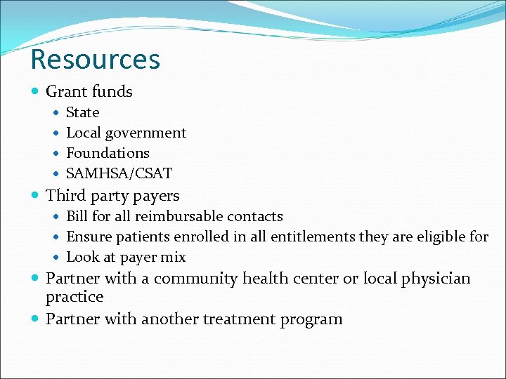 Resources Grant funds State Local government Foundations SAMHSA/CSAT Third party payers Bill for all reimbursable contacts Ensure patients enrolled in all entitlements they are eligible for Look at payer mix Partner with a community health center or local physician practice Partner with another treatment program