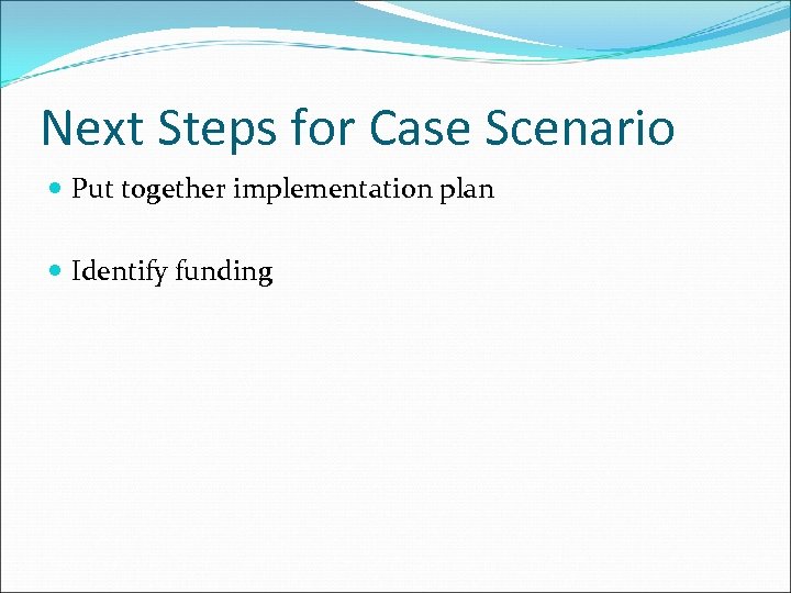 Next Steps for Case Scenario Put together implementation plan Identify funding