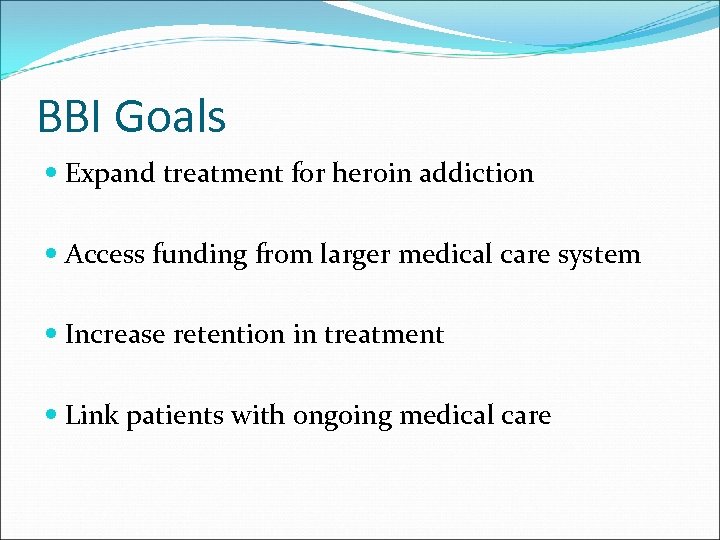 BBI Goals Expand treatment for heroin addiction Access funding from larger medical care system Increase retention in treatment Link patients with ongoing medical care