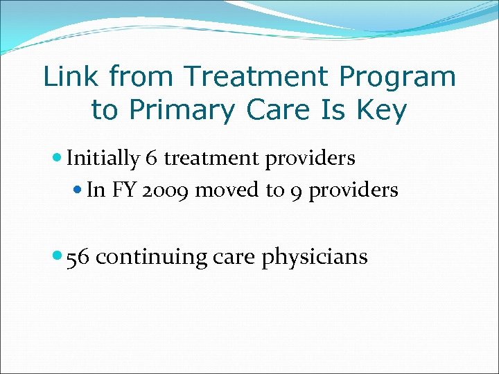 Link from Treatment Program to Primary Care Is Key Initially 6 treatment providers In FY 2009 moved to 9 providers 56 continuing care physicians