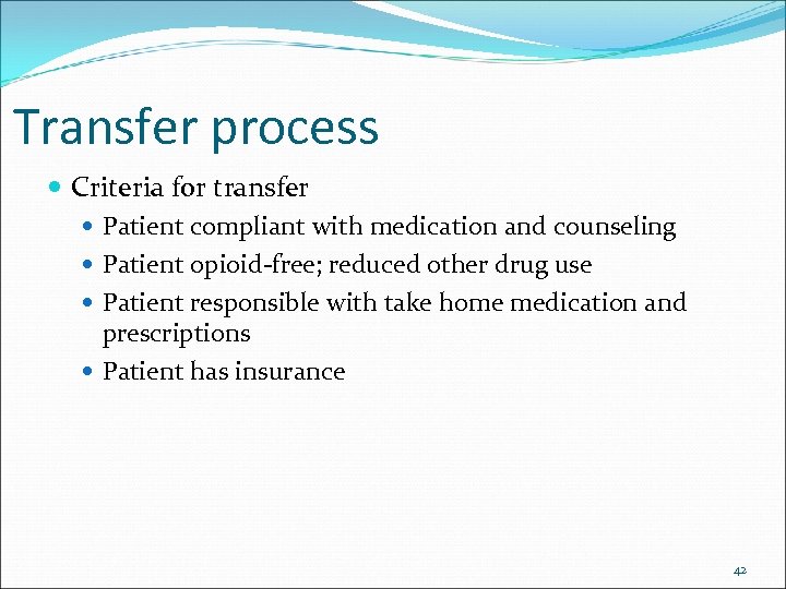 Transfer process Criteria for transfer Patient compliant with medication and counseling Patient opioid‐free; reduced other drug use Patient responsible with take home medication and prescriptions Patient has insurance 42