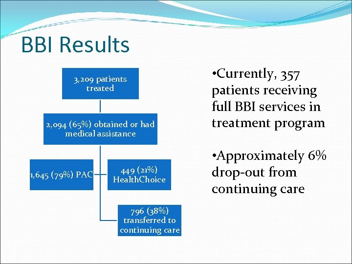BBI Results 3, 209 patients treated 2, 094 (65%) obtained or had medical assistance 1, 645 (79%) PAC 449 (21%) Health. Choice 796 (38%) transferred to continuing care • Currently, 357 patients receiving full BBI services in treatment program • Approximately 6% drop‐out from continuing care