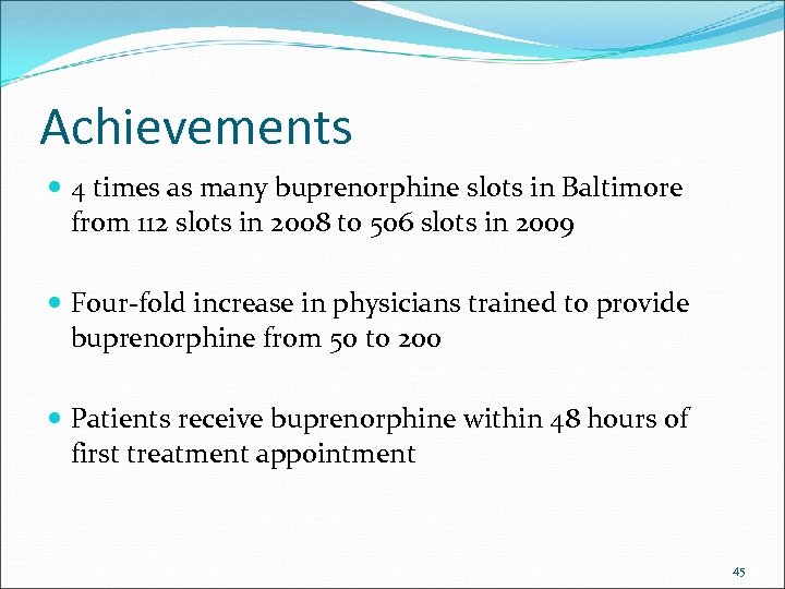 Achievements 4 times as many buprenorphine slots in Baltimore from 112 slots in 2008 to 506 slots in 2009 Four‐fold increase in physicians trained to provide buprenorphine from 50 to 200 Patients receive buprenorphine within 48 hours of first treatment appointment 45