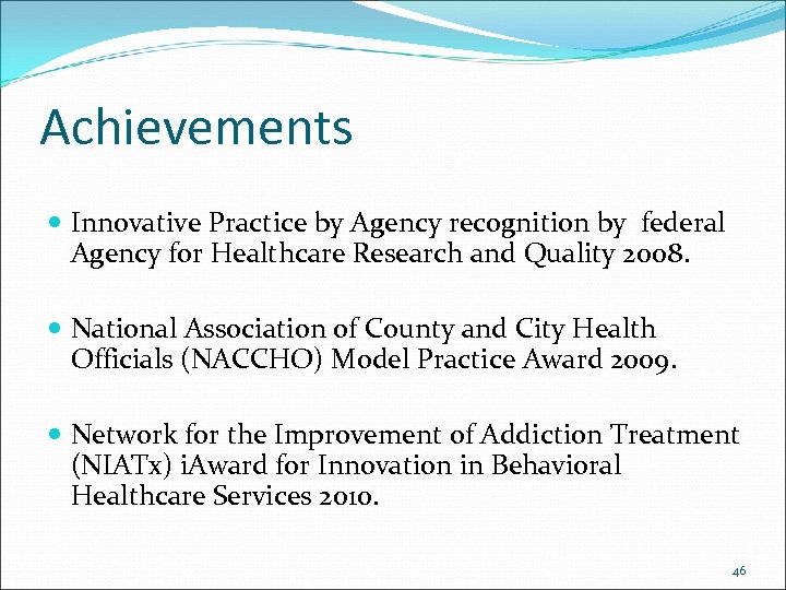 Achievements Innovative Practice by Agency recognition by federal Agency for Healthcare Research and Quality 2008. National Association of County and City Health Officials (NACCHO) Model Practice Award 2009. Network for the Improvement of Addiction Treatment (NIATx) i. Award for Innovation in Behavioral Healthcare Services 2010. 46