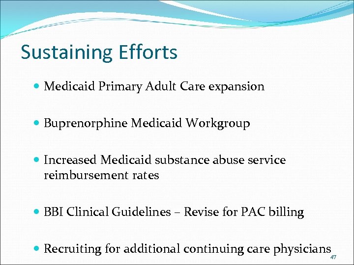Sustaining Efforts Medicaid Primary Adult Care expansion Buprenorphine Medicaid Workgroup Increased Medicaid substance abuse service reimbursement rates BBI Clinical Guidelines – Revise for PAC billing Recruiting for additional continuing care physicians 47