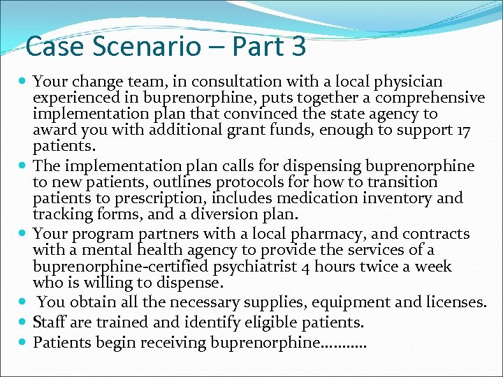 Case Scenario – Part 3 Your change team, in consultation with a local physician experienced in buprenorphine, puts together a comprehensive implementation plan that convinced the state agency to award you with additional grant funds, enough to support 17 patients. The implementation plan calls for dispensing buprenorphine to new patients, outlines protocols for how to transition patients to prescription, includes medication inventory and tracking forms, and a diversion plan. Your program partners with a local pharmacy, and contracts with a mental health agency to provide the services of a buprenorphine‐certified psychiatrist 4 hours twice a week who is willing to dispense. You obtain all the necessary supplies, equipment and licenses. Staff are trained and identify eligible patients. Patients begin receiving buprenorphine. . .