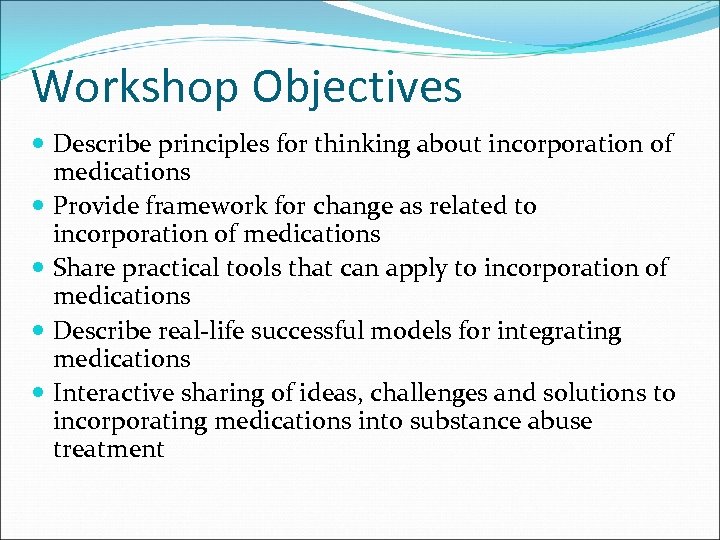 Workshop Objectives Describe principles for thinking about incorporation of medications Provide framework for change as related to incorporation of medications Share practical tools that can apply to incorporation of medications Describe real‐life successful models for integrating medications Interactive sharing of ideas, challenges and solutions to incorporating medications into substance abuse treatment