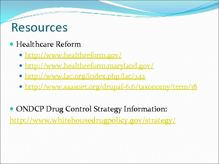 Resources Healthcare Reform http: //www. healthreform. gov/ http: //www. healthreform. maryland. gov/ http: //www. lac. org/index. php/lac/342 http: //www. saasnet. org/drupal‐ 6. 6/taxonomy/term/18 ONDCP Drug Control Strategy Information: http: //www. whitehousedrugpolicy. gov/strategy/