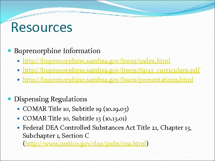 Resources Buprenorphine Information http: //buprenorphine. samhsa. gov/bwns/index. html http: //buprenorphine. samhsa. gov/bwns/tip 43_curriculum. pdf http: //buprenorphine. samhsa. gov/bwns/presentations. html Dispensing Regulations COMAR Title 10, Subtitle 19 (10. 19. 03) COMAR Title 10, Subtitle 13 (10. 13. 01) Federal DEA Controlled Substances Act Title 21, Chapter 13, Subchapter 1, Section C (http: //www. justice. gov/dea/pubs/csa. html)