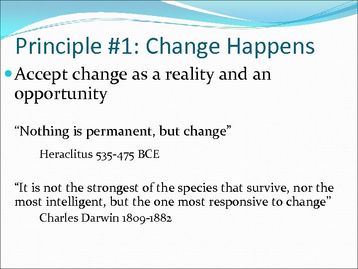 Principle #1: Change Happens Accept change as a reality and an opportunity “Nothing is permanent, but change” Heraclitus 535‐ 475 BCE “It is not the strongest of the species that survive, nor the most intelligent, but the one most responsive to change” Charles Darwin 1809‐ 1882