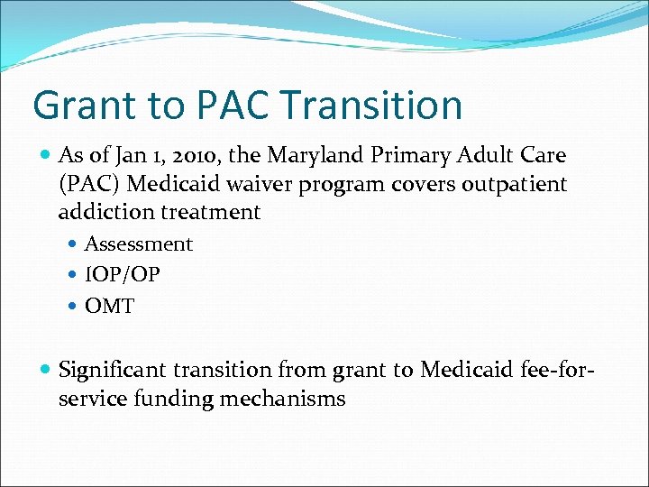 Grant to PAC Transition As of Jan 1, 2010, the Maryland Primary Adult Care (PAC) Medicaid waiver program covers outpatient addiction treatment Assessment IOP/OP OMT Significant transition from grant to Medicaid fee‐for‐ service funding mechanisms