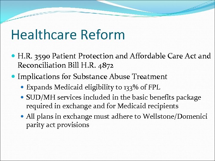 Healthcare Reform H. R. 3590 Patient Protection and Affordable Care Act and Reconciliation Bill H. R. 4872 Implications for Substance Abuse Treatment Expands Medicaid eligibility to 133% of FPL SUD/MH services included in the basic benefits package required in exchange and for Medicaid recipients All plans in exchange must adhere to Wellstone/Domenici parity act provisions