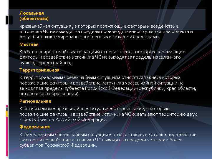 Локальная (объектовая) чрезвычайная ситуация , в которых поражающие факторы и воздействие источника ЧС не выходят за пределы производственного участка или объекта и могут быть ликвидированы собственными силами и средствами. Местная К местным чрезвычайным ситуациям относят такие, в которых поражающие факторы и воздействие источника ЧС не выходят за пределы населенного пункта, города (района). Территориальная К территориальным чрезвычайным ситуациям относятся такие, в которых поражающие факторы и воздействие источника чрезвычайной ситуации не выходят за пределы субъекта Российской Федерации (республики, края области, автономного образования). Региональная К региональным чрезвычайным ситуациям относят такие, в которых поражающие факторы и воздействие источника ЧС охватывают территорию двух трех субъектов Российской Федерации. Федеральная К федеральным чрезвычайным ситуациям относят такие, в которых поражающие факторы и воздействие источника ЧС выходят за пределы четырех и более субъек тов Российской Федерации.