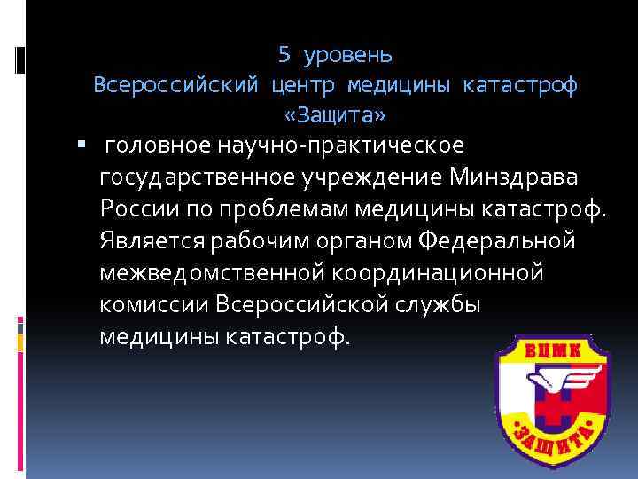 5 уровень Всероссийский центр медицины катастроф «Защита» головное научно практическое государственное учреждение Минздрава России по проблемам медицины катастроф. Является рабочим органом Федеральной межведомственной координационной комиссии Всероссийской службы медицины катастроф.