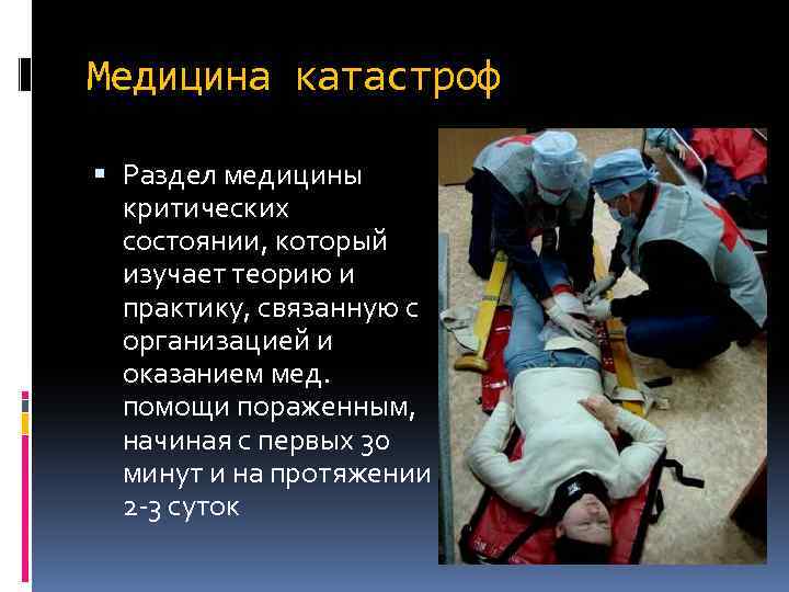 Медицина катастроф Раздел медицины критических состоянии, который изучает теорию и практику, связанную с организацией и оказанием мед. помощи пораженным, начиная с первых 30 минут и на протяжении 2 3 суток