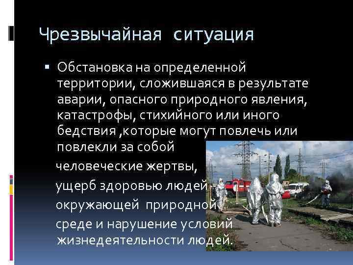 Чрезвычайная ситуация Обстановка на определенной территории, сложившаяся в результате аварии, опасного природного явления, катастрофы, стихийного или иного бедствия , которые могут повлечь или повлекли за собой человеческие жертвы, ущерб здоровью людей окружающей природной среде и нарушение условий жизнедеятельности людей.