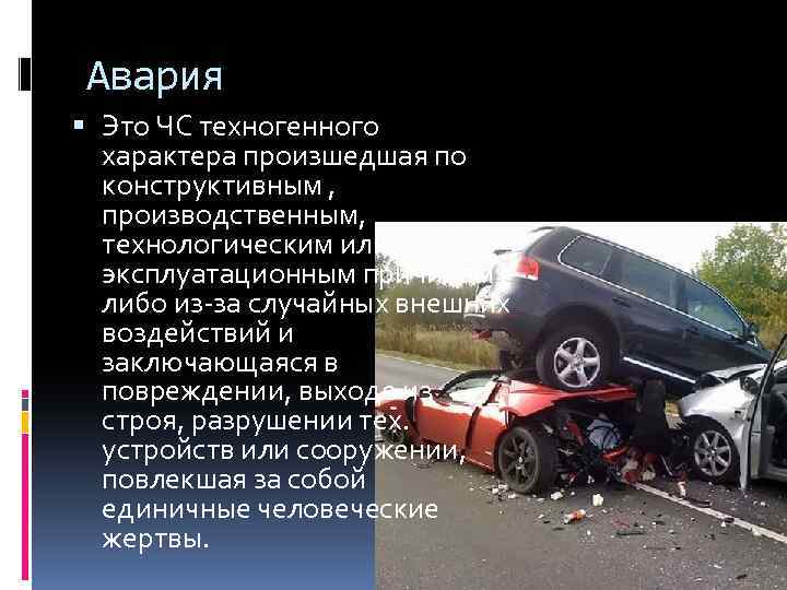 Авария Это ЧС техногенного характера произшедшая по конструктивным , производственным, технологическим или эксплуатационным причинам либо из за случайных внешних воздействий и заключающаяся в повреждении, выходе из строя, разрушении тех. устройств или сооружении, повлекшая за собой единичные человеческие жертвы.