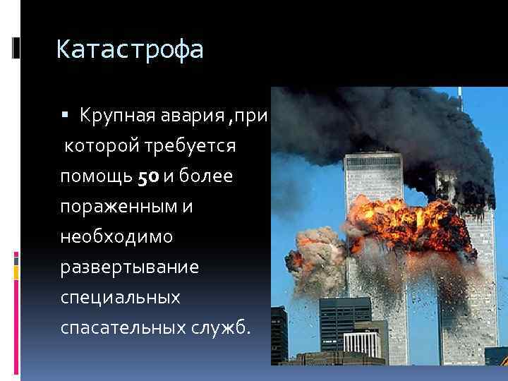 Катастрофа Крупная авария , при которой требуется помощь 50 и более пораженным и необходимо развертывание специальных спасательных служб.