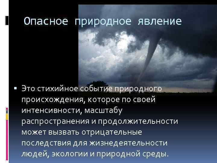Опасное природное явление Это стихийное событие природного происхождения, которое по своей интенсивности, масштабу распространения и продолжительности может вызвать отрицательные последствия для жизнедеятельности людей, экологии и природной среды.