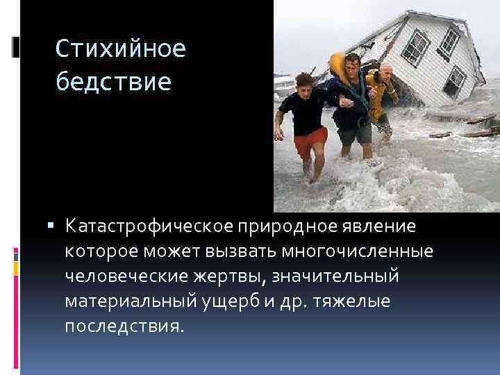 Стихийное бедствие Катастрофическое природное явление которое может вызвать многочисленные человеческие жертвы, значительный материальный ущерб и др. тяжелые последствия.