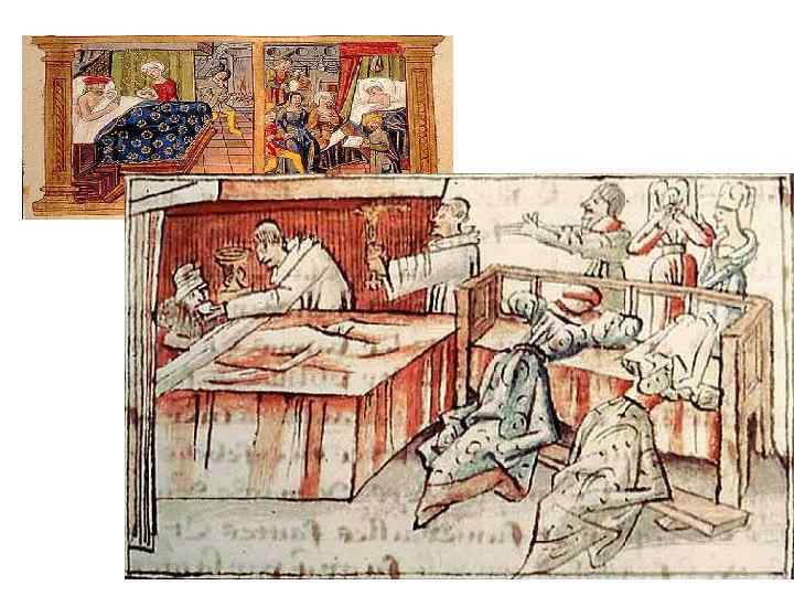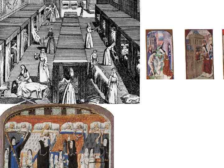 Больничное дело • Христианские госпитали – Y-Y 1 вв. при кафедральных соборах и монастырях. Презрение слабых, немощных и бездомных) • Х –Х 1 Y вв – городские госпитали – функции приютов и больниц. • Все больные размещались в однойм помещении; • Кровати разделялись ширмами или занавесями.