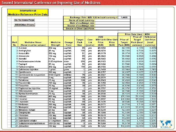 International Reference Price (IRP) § The IRP chosen is the median price in the MSH catalogue of prices from profit and non -profit international suppliers to public sector § Countries may use another set of IRPs available on the web, e. g. Australian PBSprices § Conversion of local prices to USD § The workbook calculates ratios of local prices to the IRP