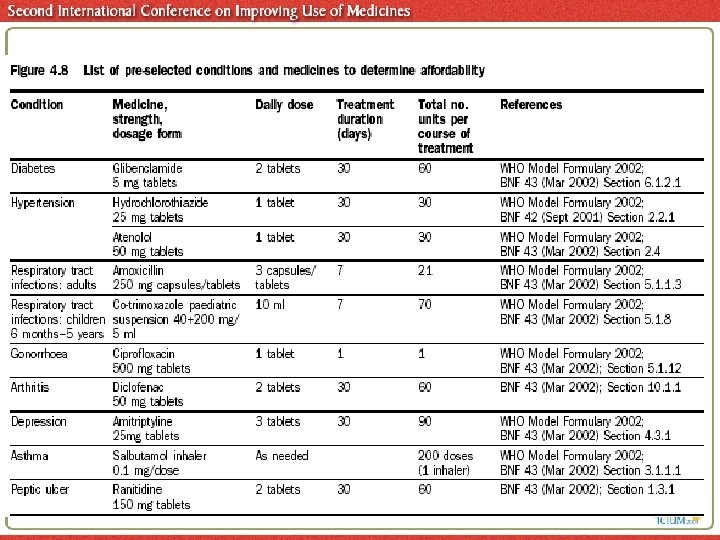 Survey tools § Systematic sampling of medicine outlets in at least 4 areas, minimum of 10 pharmacies per area § Prices of 30 preselected commonly used medicines in at least public and private sectors § Predetermined dose forms, strengths and recommended pack sizes § Supplementary lists encouraged, adapted to local needs § Innovator brand generic (most sold and lowest price) prices sampled § Local prices compared to international reference prices § All components of price from manufacturer to retailer identified § Affordability assessed for 10 preselected courses of treatment
