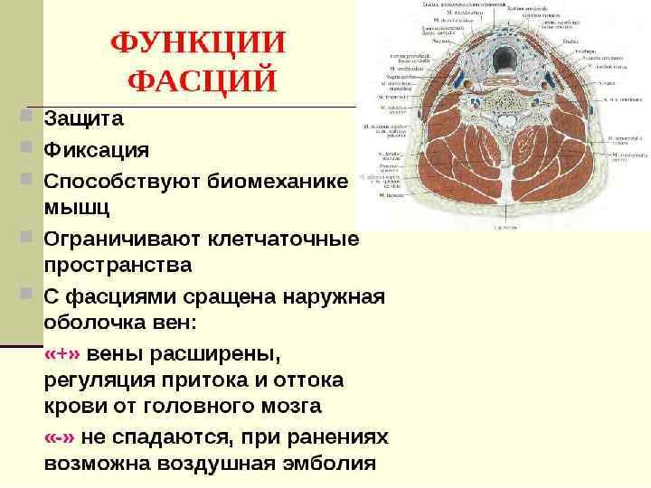 Мышцы шеи Поверхностные мышцы Подкожная мышца шеи (m. platisma) Начало: фасция дельтовидной и большой грудной мышц. Прикрепление: угол рта, край нижней челюсти Функция: поднимает кожу шеи, оттягивает угол рта кнаружи и книзу