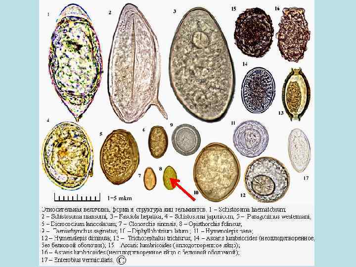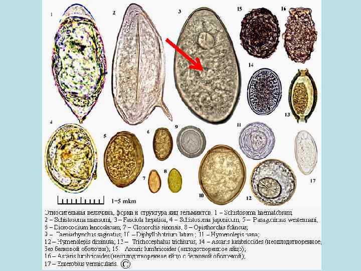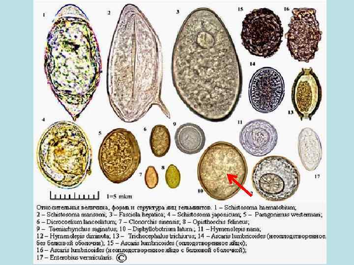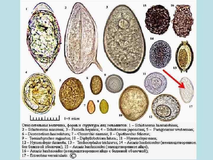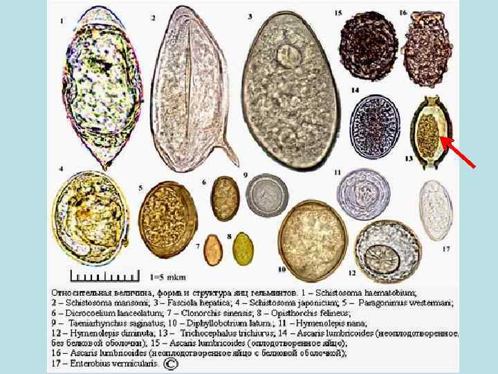 Тип Nemathelminthes Класс Nematoda Enterobius vermicularis Размеры яиц 50 -60 х26 -30 мкм Форма овальновытянутая, асимметричная (одна сторона выпуклая, другая – более плоская) Оболочка тонкая, гладкая, прозрачная, бесцветная