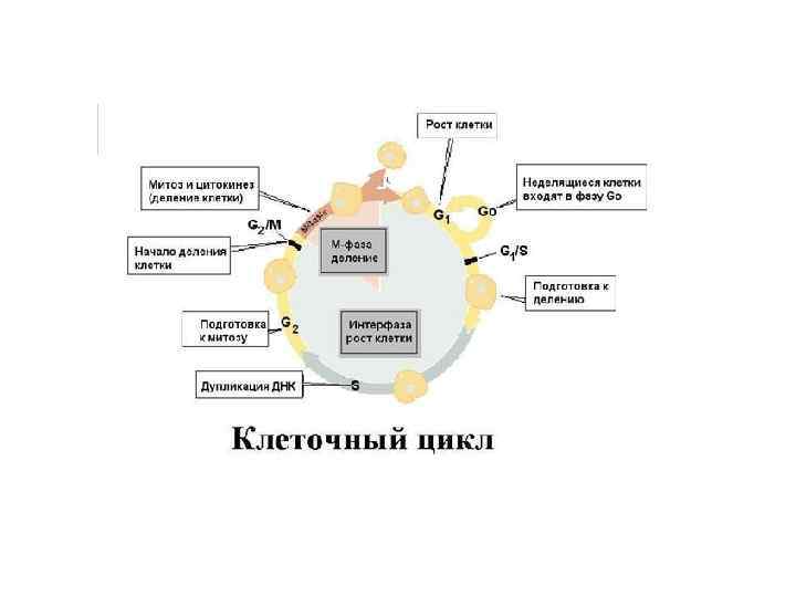 Организация жизни клетки • Клеточный или жизненный цикл – период от момента образования клетки до ее гибели или до конца следующего деления (рост, дифференцировка, выполнение функций, периоды покоя, подготовка к делению, деление) • Митотический (пролиферативный) цикл – период подготовки клетки к делению (интерфаза) и само деление (митоз). • В эмбриональный период МЦ продолжается 6 часов, у взрослого человека – несколько суток