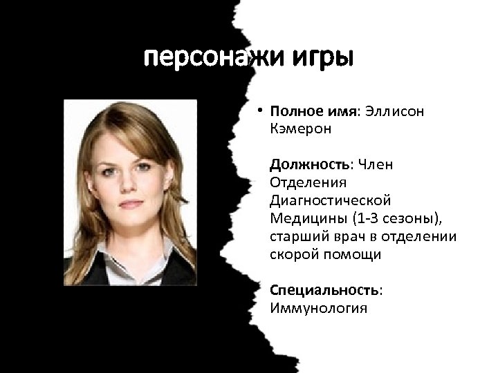 персонажи игры • Полное имя: Эллисон Кэмерон Должность: Член Отделения Диагностической Медицины (1 -3 сезоны), старший врач в отделении скорой помощи Специальность: Иммунология