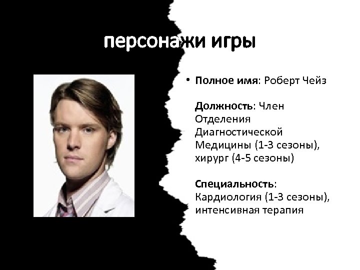персонажи игры • Полное имя: Роберт Чейз Должность: Член Отделения Диагностической Медицины (1 -3 сезоны), хирург (4 -5 сезоны) Специальность: Кардиология (1 -3 сезоны), интенсивная терапия