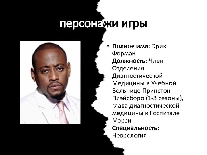 персонажи игры • Полное имя: Эрик Форман Должность: Член Отделения Диагностической Медицины в Учебной Больнице Принстон. Плэйсборо (1 -3 сезоны), глава диагностической медицины в Госпитале Мэрси Специальность: Неврология