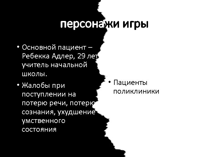 персонажи игры • Основной пациент – Ребекка Адлер, 29 лет, учитель начальной школы. • Пациенты • Жалобы при поликлиники поступлении на потерю речи, потерю сознания, ухудшение умственного состояния