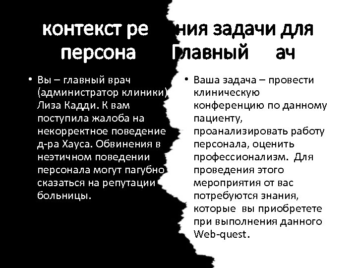 контекст решения задачи для персонажа Главный врач • Вы – главный врач (администратор клиники) Лиза Кадди. К вам поступила жалоба на некорректное поведение д-ра Хауса. Обвинения в неэтичном поведении персонала могут пагубно сказаться на репутации больницы. • Ваша задача – провести клиническую конференцию по данному пациенту, проанализировать работу персонала, оценить профессионализм. Для проведения этого мероприятия от вас потребуются знания, которые вы приобретете при выполнения данного Web-quest.