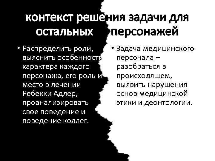 контекст решения задачи для остальных персонажей • Распределить роли, • Задача медицинского выяснить особенности персонала – характера каждого разобраться в персонажа, его роль и происходящем, место в лечении выявить нарушения Ребекки Адлер, основ медицинской проанализировать этики и деонтологии. свое поведение и поведение коллег.