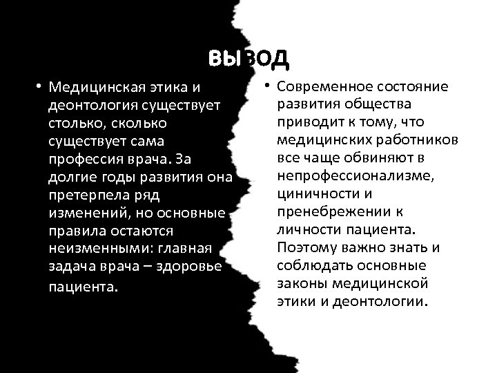 вывод • Медицинская этика и деонтология существует столько, сколько существует сама профессия врача. За долгие годы развития она претерпела ряд изменений, но основные правила остаются неизменными: главная задача врача – здоровье пациента. . • Современное состояние развития общества приводит к тому, что медицинских работников все чаще обвиняют в непрофессионализме, циничности и пренебрежении к личности пациента. Поэтому важно знать и соблюдать основные законы медицинской этики и деонтологии.