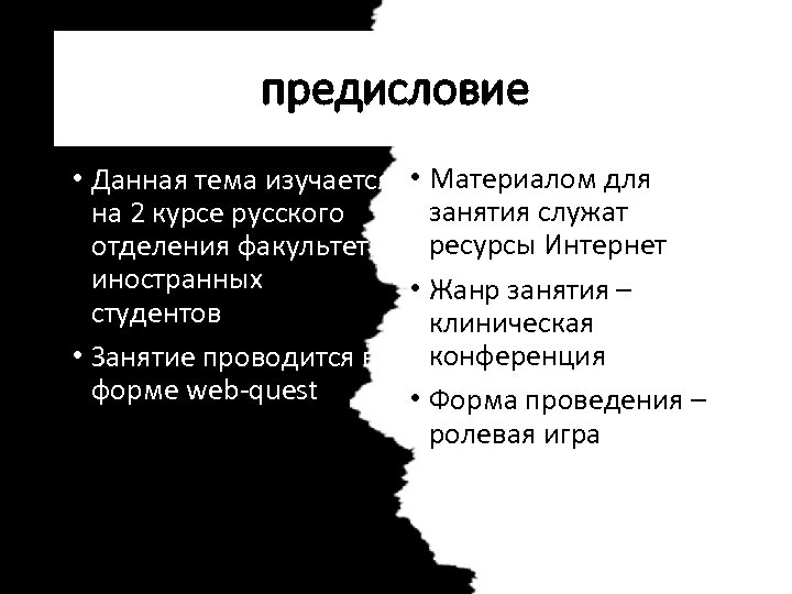 предисловие • Данная тема изучается на 2 курсе русского отделения факультета иностранных студентов • Занятие проводится в форме web-quest • Материалом для занятия служат ресурсы Интернет • Жанр занятия – клиническая конференция • Форма проведения – ролевая игра