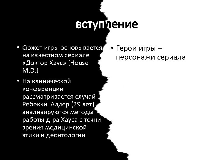 вступление • Сюжет игры основывается • Герои игры – на известном сериале персонажи сериала «Доктор Хаус» (House M. D. ) • На клинической конференции рассматривается случай Ребекки Адлер (29 лет), анализируются методы работы д-ра Хауса с точки зрения медицинской этики и деонтологии