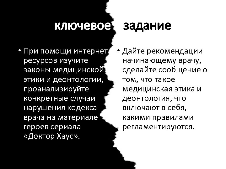 ключевое задание • При помощи интернет • Дайте рекомендации ресурсов изучите начинающему врачу, законы медицинской сделайте сообщение о этики и деонтологии, том, что такое проанализируйте медицинская этика и конкретные случаи деонтология, что нарушения кодекса включают в себя, врача на материале какими правилами героев сериала регламентируются. «Доктор Хаус» .