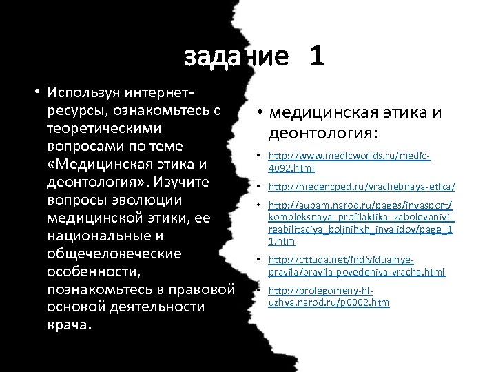 задание 1 • Используя интернетресурсы, ознакомьтесь с теоретическими вопросами по теме «Медицинская этика и деонтология» . Изучите вопросы эволюции медицинской этики, ее национальные и общечеловеческие особенности, познакомьтесь в правовой основой деятельности врача. • медицинская этика и деонтология: • http: //www. medicworlds. ru/medic 4092. html • http: //medencped. ru/vrachebnaya-etika/ • http: //aupam. narod. ru/pages/invasport/ kompleksnaya_profilaktika_zabolevaniyj_ reabilitaciya_boljnihkh_invalidov/page_1 1. htm • http: //ottuda. net/individualnyepravila/pravila-povedeniya-vracha. html • http: //prolegomeny-hiuzhva. narod. ru/p 0002. htm