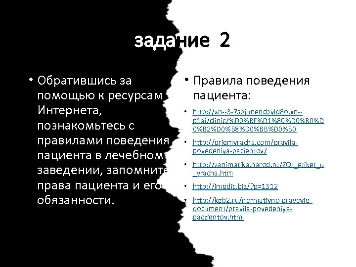 задание 2 • Обратившись за • Правила поведения помощью к ресурсам пациента: • http: //xn--3 -7 sbjunencbyld 8 o. xn-Интернета, p 1 ai/clinic/%D 0%BF%D 1%80%D 0%B 0%D познакомьтесь с 0%B 2%D 0%B 8%D 0%BB%D 0%B 0 правилами поведения • http: //priemvracha. com/pravilapovedeniya-pacientov/ пациента в лечебном • http: //zanimatika. narod. ru/ZOJ_etiket_u заведении, запомните _vracha. htm права пациента и его • http: //imedic. biz/? p=1312 • http: //kgb 2. ru/normativno-pravovieобязанности. document/pravila-povedeniyapaczientov. html