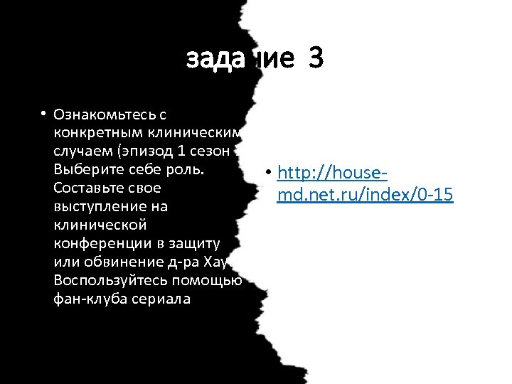 задание 3 • Ознакомьтесь с конкретным клиническим случаем (эпизод 1 сезон 1). Выберите себе роль. • http: //house. Составьте свое md. net. ru/index/0 -15 выступление на клинической конференции в защиту или обвинение д-ра Хауса. Воспользуйтесь помощью фан-клуба сериала