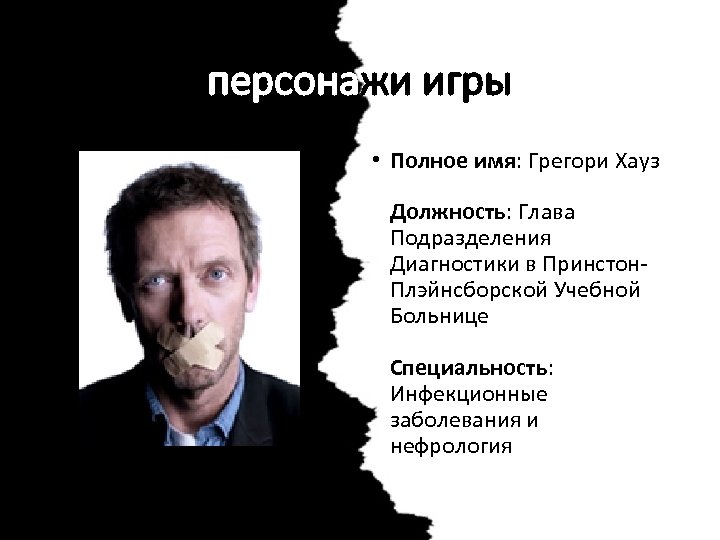 персонажи игры • Полное имя: Грегори Хауз Должность: Глава Подразделения Диагностики в Принстон. Плэйнсборской Учебной Больнице Специальность: Инфекционные заболевания и нефрология